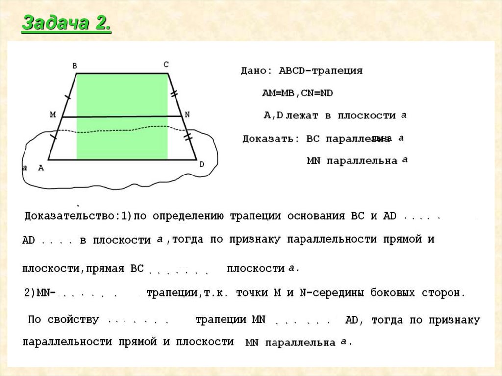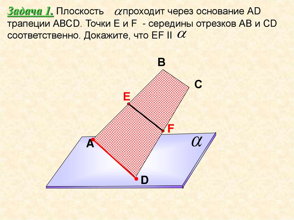 Задача 1. Плоскость проходит через основание АDтрапеции АВСD. Точки Е и F - середины отрезков АВ и СD