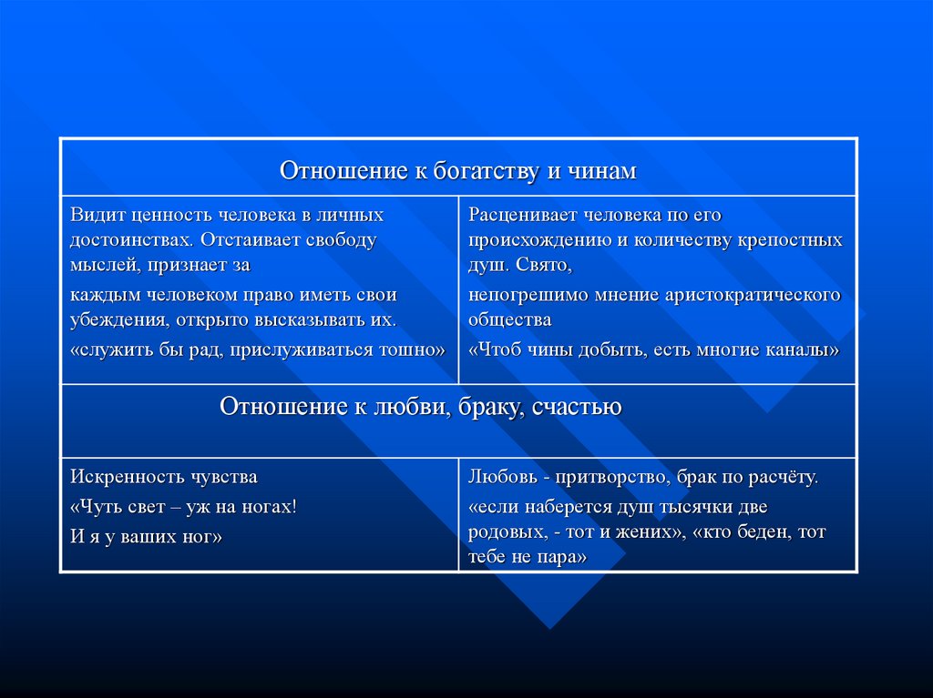 Отношение к богатству и чинамВидит ценность человека в личных