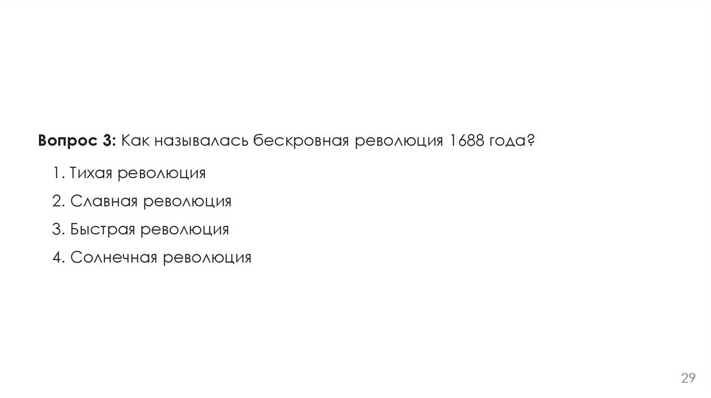Вопрос 3: Как называлась бескровная революция 1688 года?1. Тихая революция