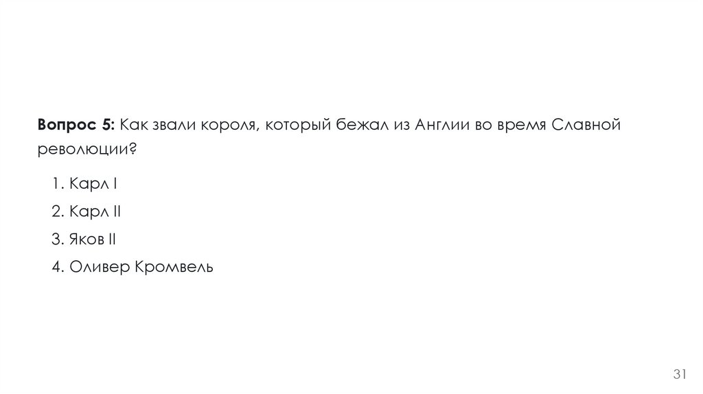 Вопрос 5: Как звали короля, который бежал из Англии во время Славнойреволюции?