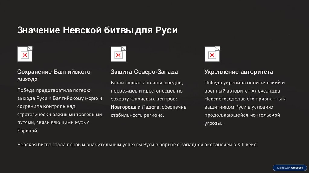 Невская битва стала первым значительным успехом Руси в борьбе с западной экспансией в XIII веке.