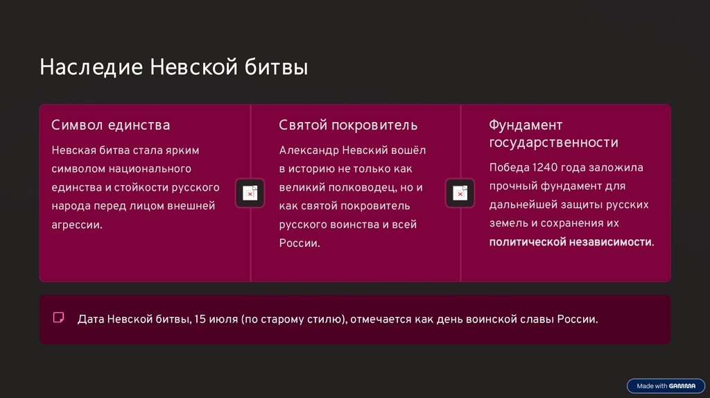 Дата Невской битвы, 15 июля (по старому стилю), отмечается как день воинской славы России.
