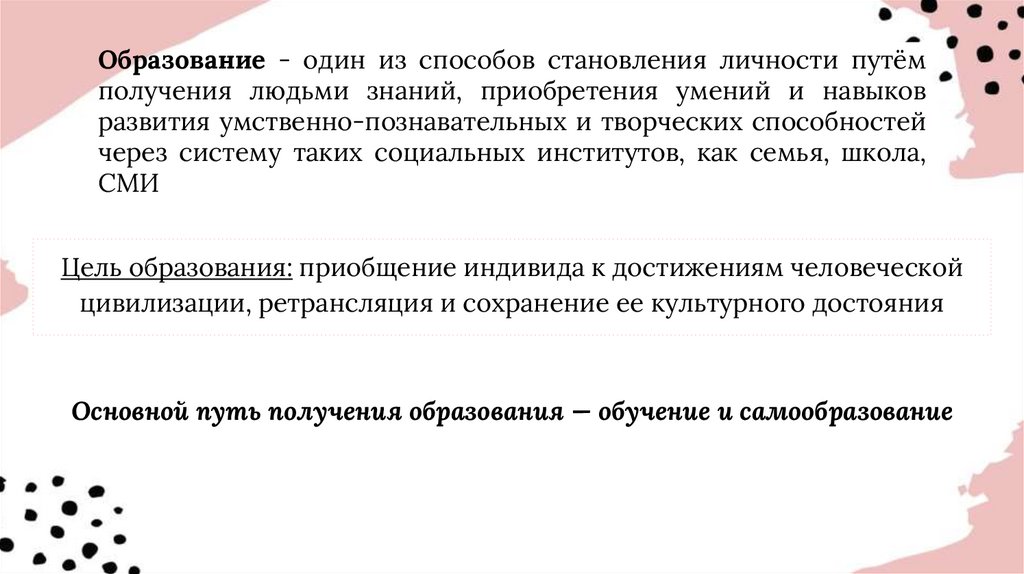 Образование - один из способов становления личности путёмполучения людьми знаний, приобретения умений и навыков