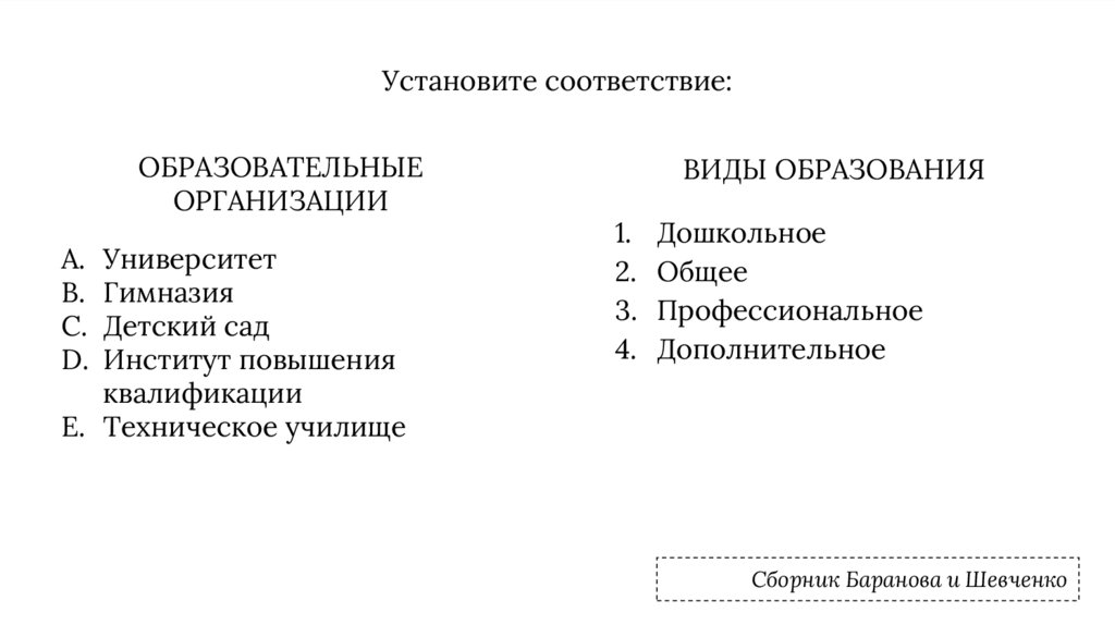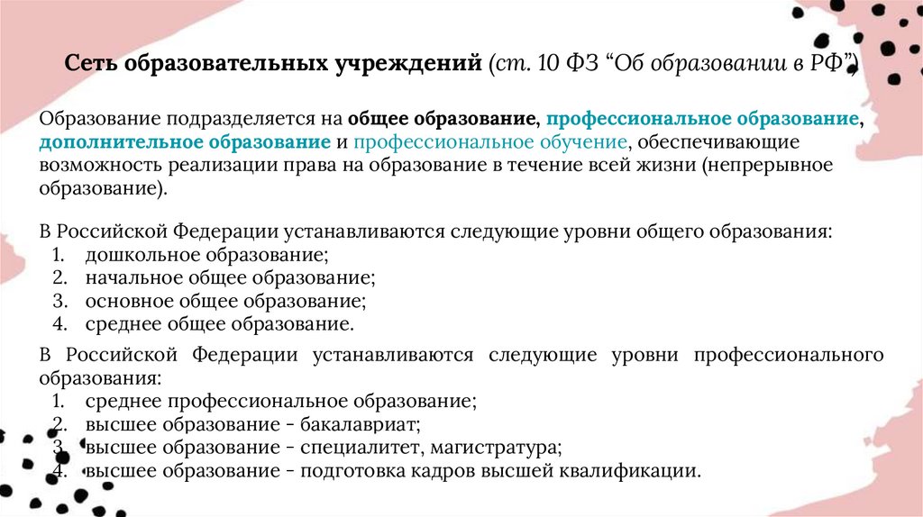 Сеть образовательных учреждений (ст. 10 ФЗ “Об образовании в РФ”)Образование подразделяется на общее образование, профессиональное образование,