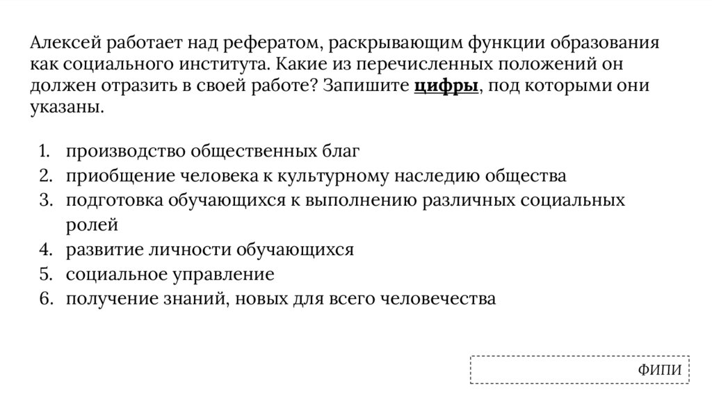Алексей работает над рефератом, раскрывающим функции образованиякак социального института. Какие из перечисленных положений он