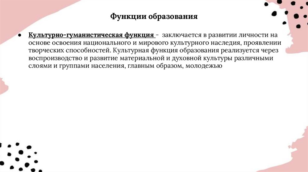Функции образованияКультурно-гуманистическая функция - заключается в развитии личности на