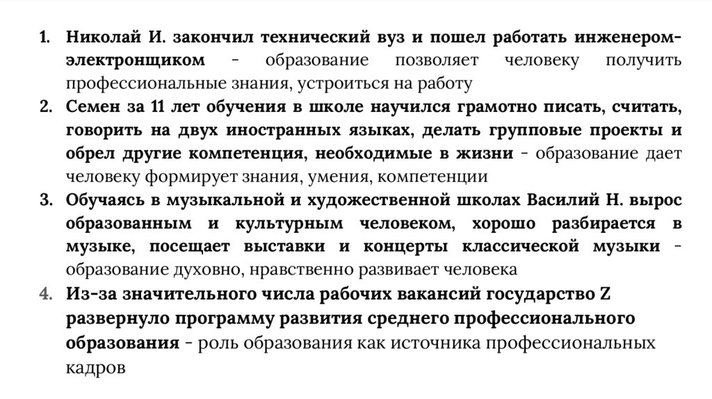 С помощью трёх примеров покажите проявление роли образования вжизни современного общества. В каждом случае сначала приведите