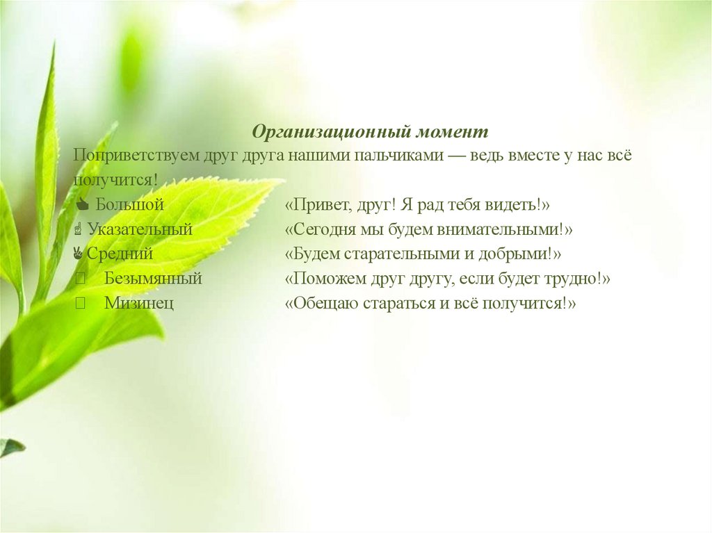 Организационный моментПоприветствуем друг друга нашими пальчиками — ведь вместе у нас всё