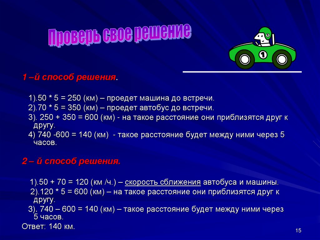 9. Первый способ решения. 1) 72 + 68 =140 (км /ч.) – скорость сближения таксистов. 2).140 * 2 = 280 (км) – на такое расстояние