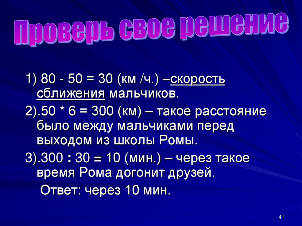 1) 80 - 50 = 30 (км /ч.) –скоростьсближения мальчиков.