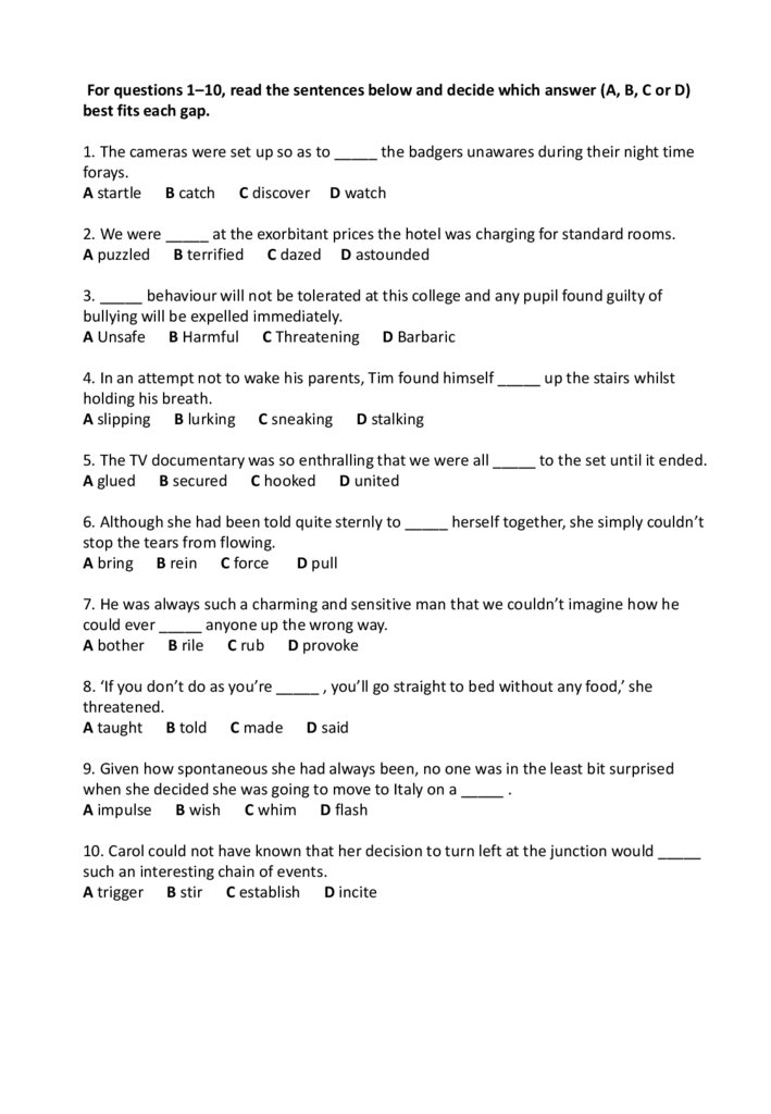 For questions 1–10, read the sentences below and decide which answer (A, B, C or D)best fits each gap.