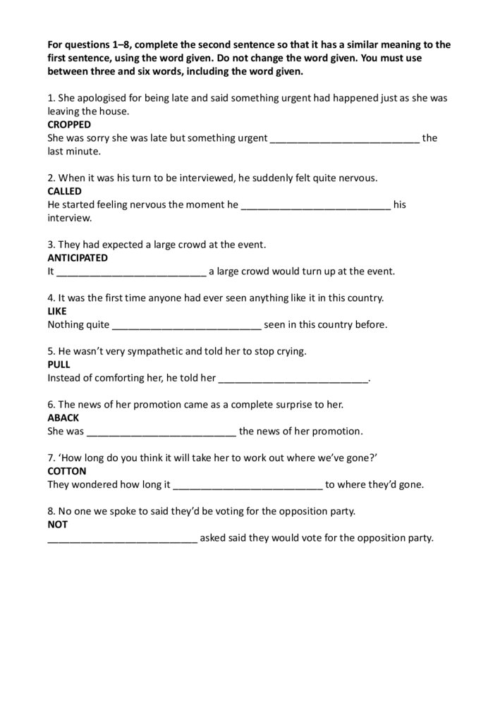 For questions 1–8, complete the second sentence so that it has a similar meaning to thefirst sentence, using the word given. Do not change the word given. You must use