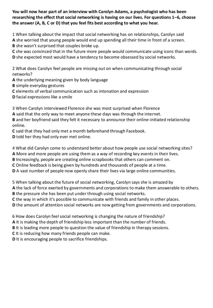 You will now hear part of an interview with Carolyn Adams, a psychologist who has beenresearching the effect that social networking is having on our lives. For questions 1–6, choose