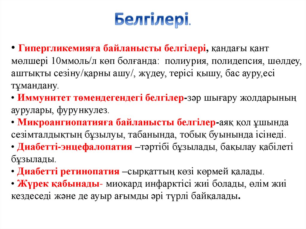 • Гипергликемияға байланысты белгілері, қандағы қантмөлшері 10ммоль/л көп болғанда: полиурия, полидепсия, шөлдеу,