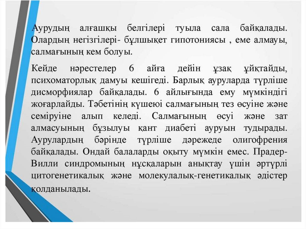 • Түр мұрагерлік – геномдық басып шығару• Локализация – жою Және инактивация гендер қосулы 15 хромосома. IN аймақ q11—q13