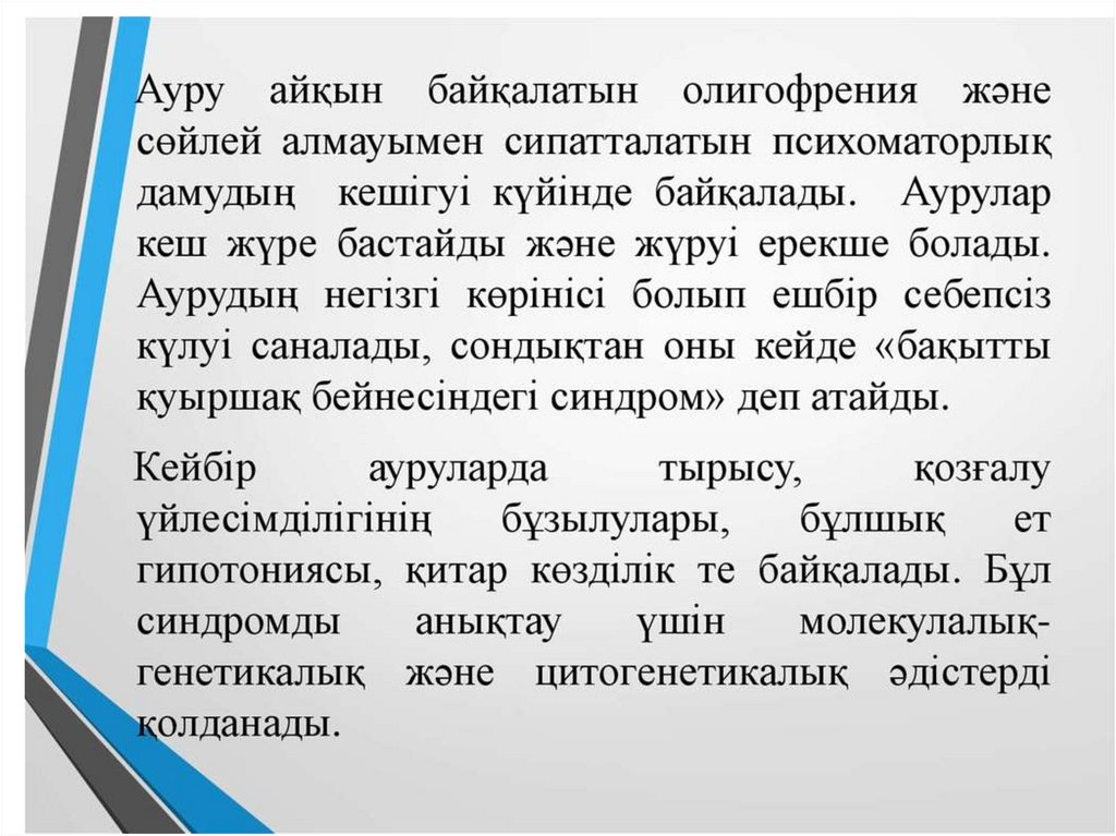 • Этиологиясы, патогенезі – сирек тұқым қуалайтын ауру, оның себебі 15q11-13 хромосома