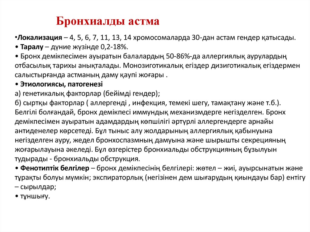 Бронхиалды астма•Локализация – 4, 5, 6, 7, 11, 13, 14 хромосомаларда 30-дан астам гендер қатысады.