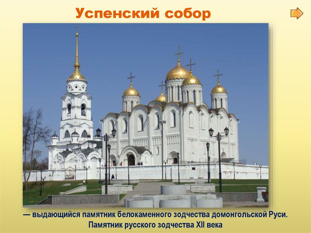 Успенский собор— выдающийся памятник белокаменного зодчества домонгольской Руси.