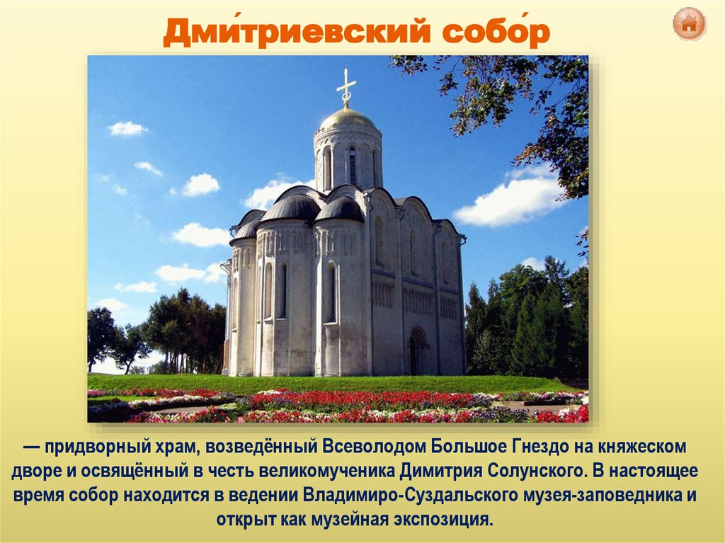Дми́триевский собо́р— придворный храм, возведённый Всеволодом Большое Гнездо на княжеском
