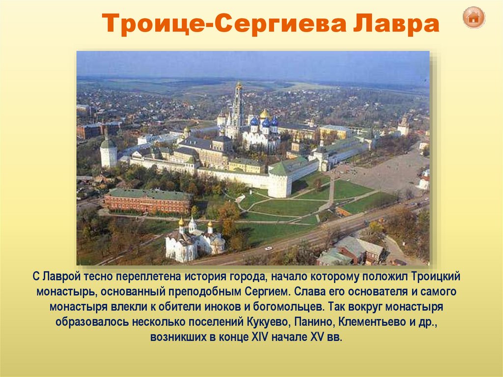 Троице-Сергиева ЛавраС Лаврой тесно переплетена история города, начало которому положил Троицкий