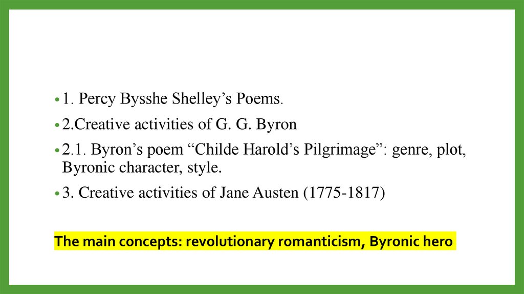 • 1. Percy Bysshe Shelley’s Poems.• 2.Creative activities of G. G. Byron
