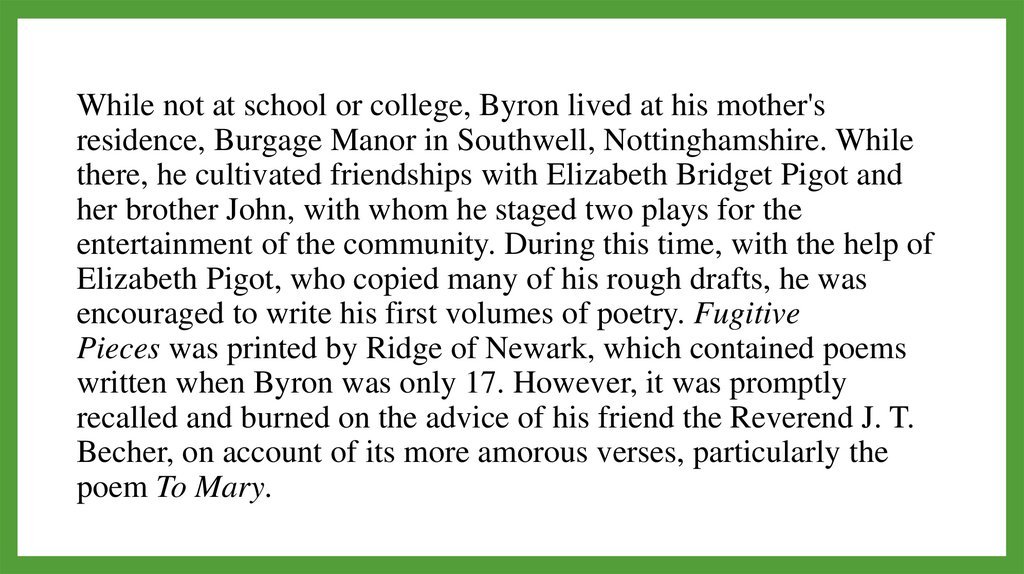 Europe together. In 1816 they met the exciting poet Lord Byron.
