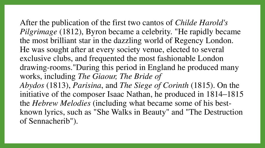 After the publication of the first two cantos of Childe Harold'sPilgrimage (1812), Byron became a celebrity. "He rapidly became