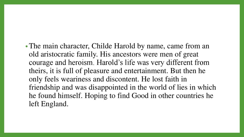 • The main character, Childe Harold by name, came from anold aristocratic family. His ancestors were men of great