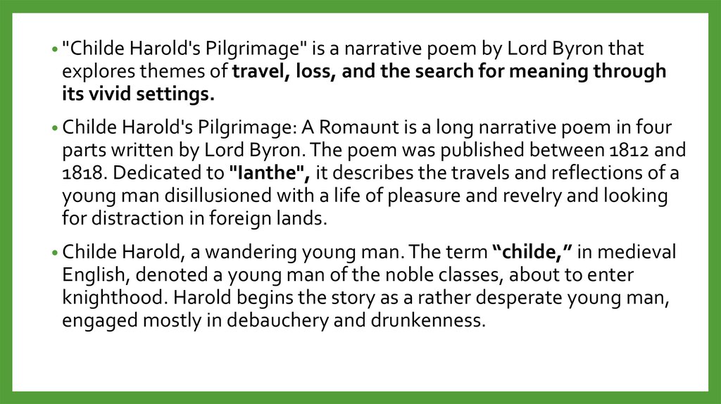 • "Childe Harold's Pilgrimage" is a narrative poem by Lord Byron thatexplores themes of travel, loss, and the search for meaning through