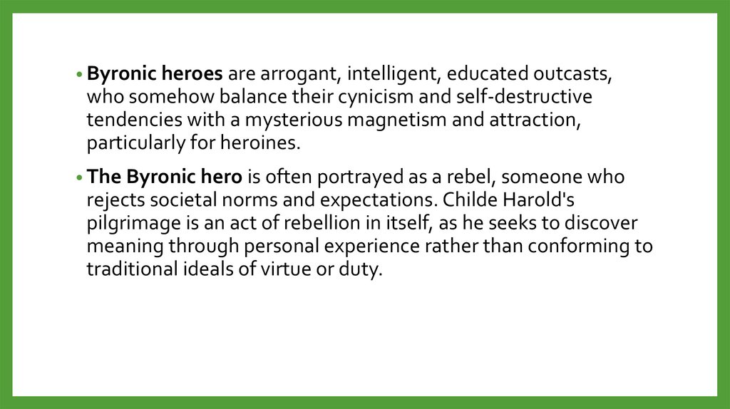 • Byronic heroes are arrogant, intelligent, educated outcasts,who somehow balance their cynicism and self-destructive
