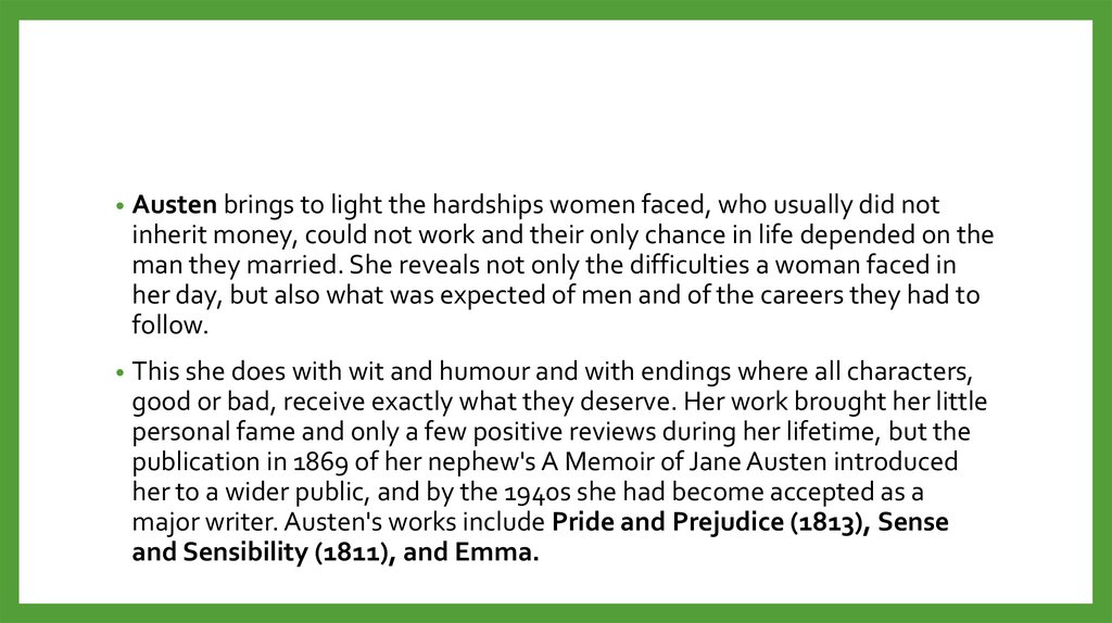 • Austen brings to light the hardships women faced, who usually did notinherit money, could not work and their only chance in life depended on the