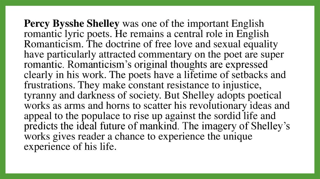 Percy Bysshe Shelley was one of the important Englishromantic lyric poets. He remains a central role in English
