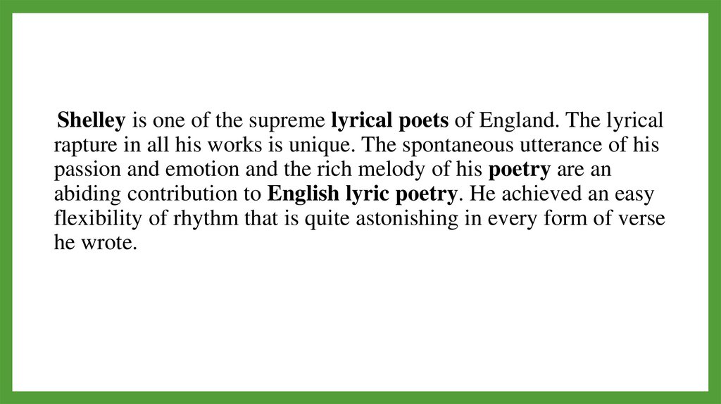 Shelley is one of the supreme lyrical poets of England. The lyricalrapture in all his works is unique. The spontaneous utterance of his