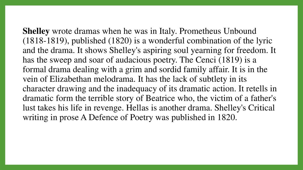 Shelley wrote dramas when he was in Italy. Prometheus Unbound(1818-1819), published (1820) is a wonderful combination of the lyric