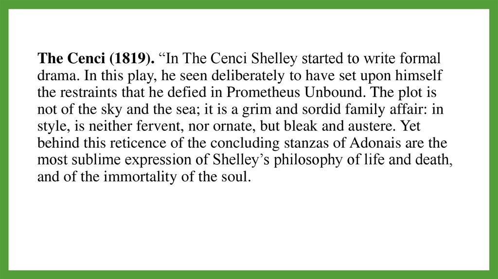 The Cenci (1819). “In The Cenci Shelley started to write formaldrama. In this play, he seen deliberately to have set upon himself