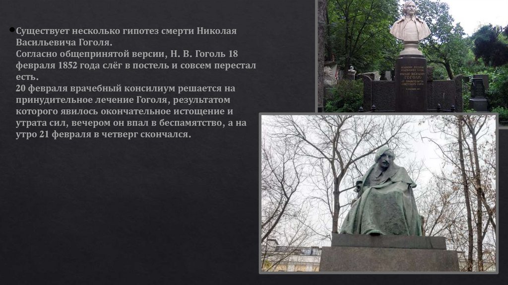 Существует несколько гипотез смерти НиколаяВасильевича Гоголя.