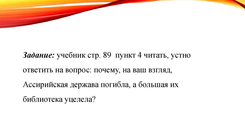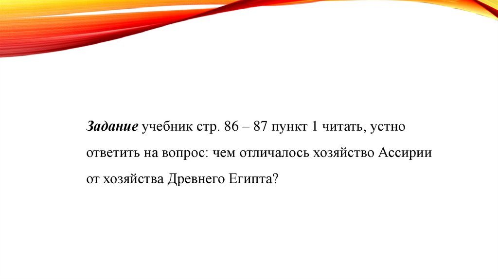Задание учебник стр. 86 – 87 пункт 1 читать, устноответить на вопрос: чем отличалось хозяйство Ассирии