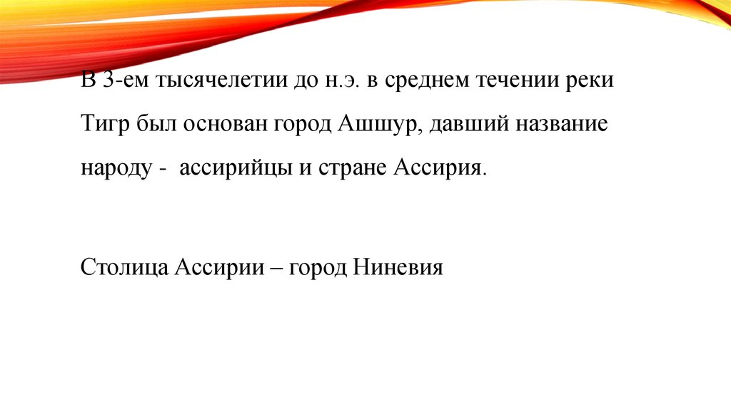 В 3-ем тысячелетии до н.э. в среднем течении рекиТигр был основан город Ашшур, давший название