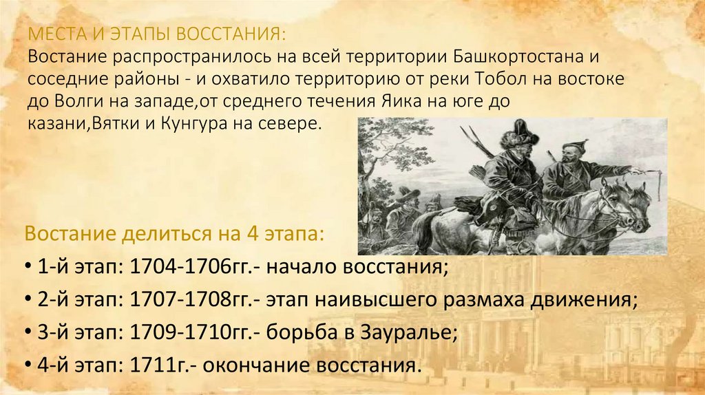 МЕСТА И ЭТАПЫ ВОССТАНИЯ:Востание распространилось на всей территории Башкортостана и