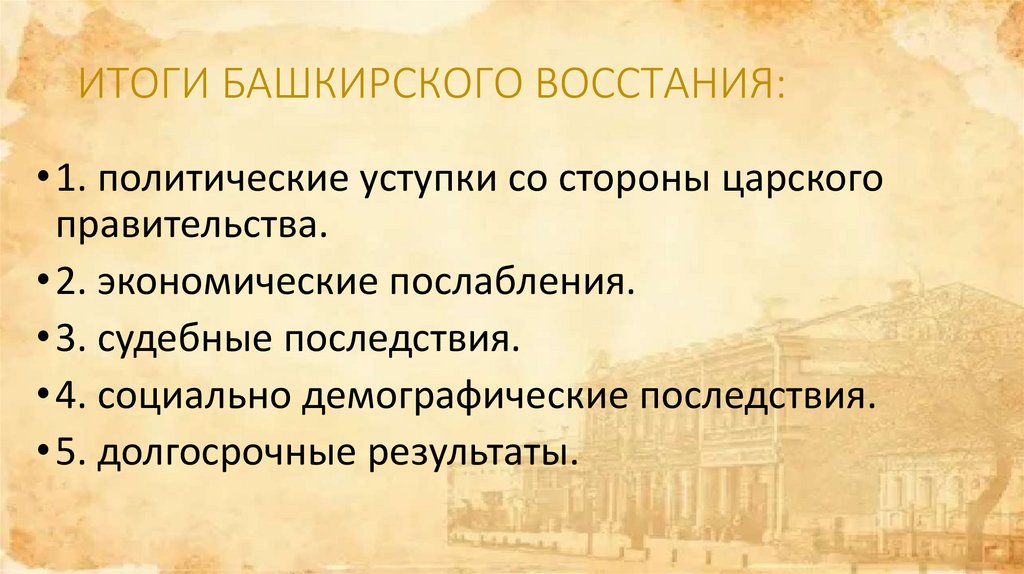 ИТОГИ БАШКИРСКОГО ВОССТАНИЯ:• 1. политические уступки со стороны царского