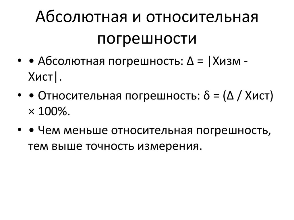 • • Абсолютная погрешность: Δ = |Xизм Xист|.