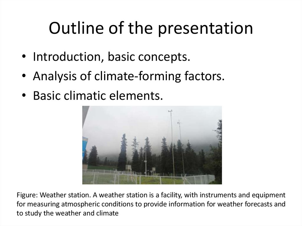 • Climate is the weather conditions prevailing in anarea in general or over a long period (30 years).