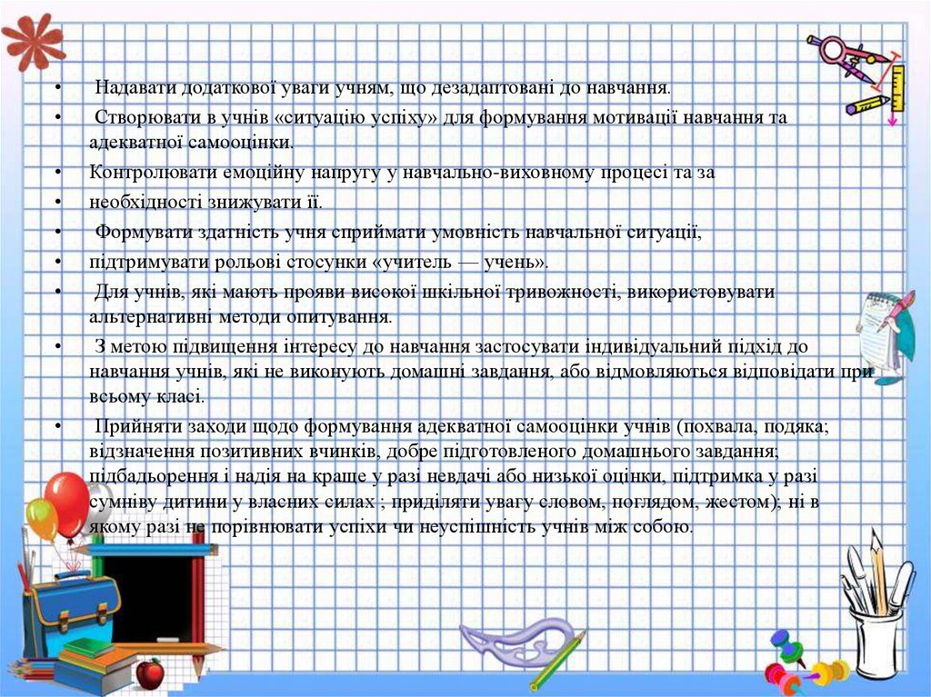 Надавати додаткової уваги учням, що дезадаптовані до навчання.