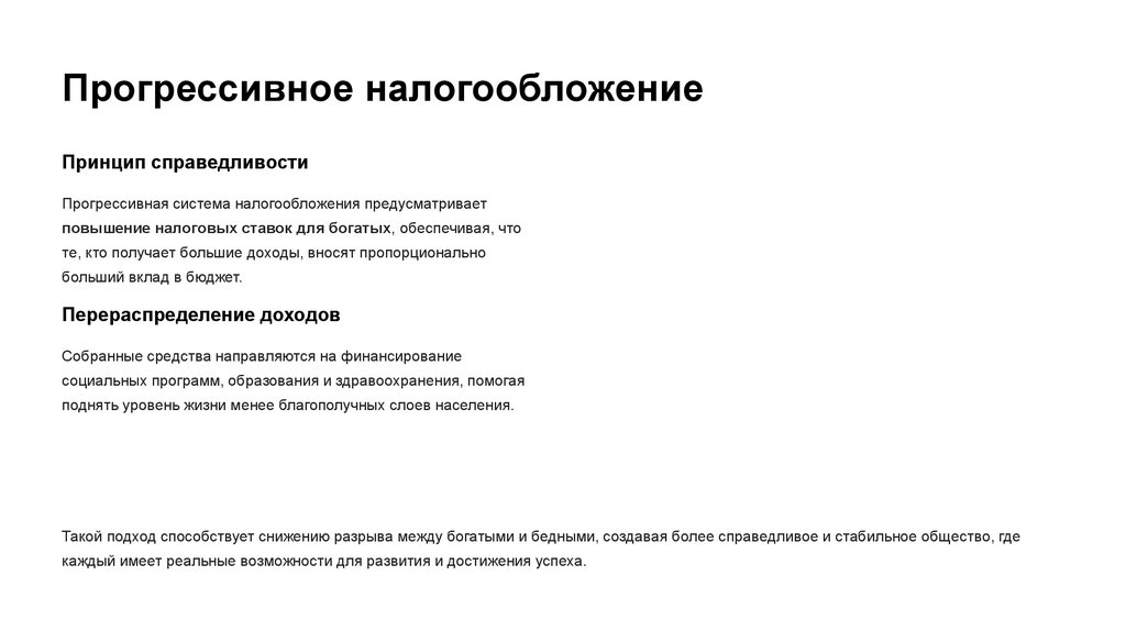 Такой подход способствует снижению разрыва между богатыми и бедными, создавая более справедливое и стабильное общество, где