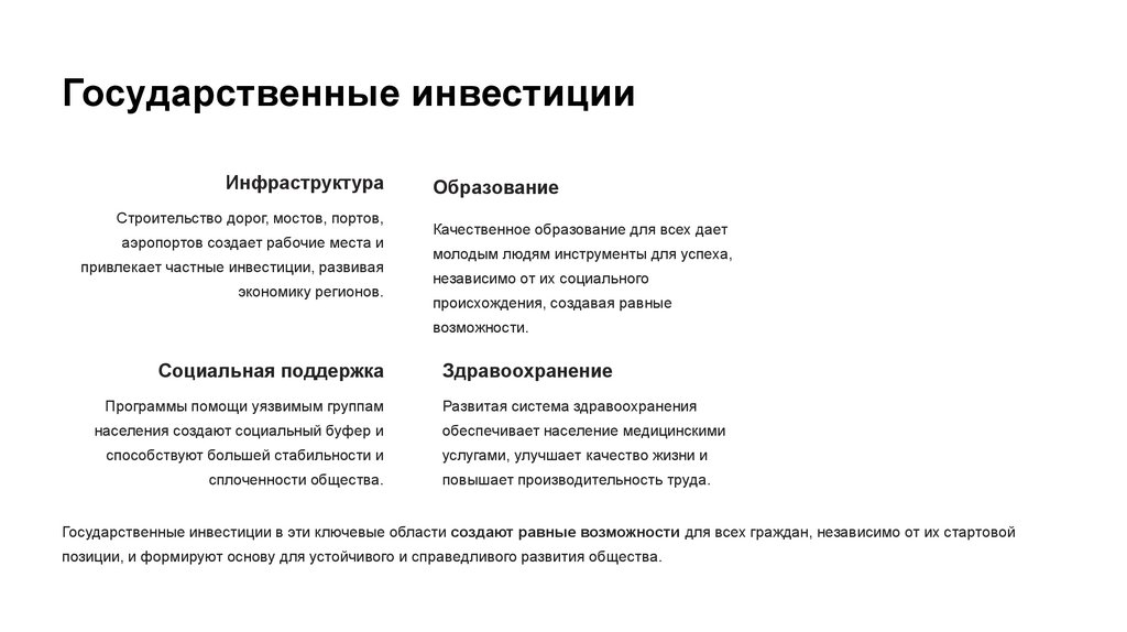 Государственные инвестиции в эти ключевые области создают равные возможности для всех граждан, независимо от их стартовой