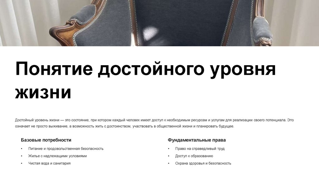 Достойный уровень жизни — это состояние, при котором каждый человек имеет доступ к необходимым ресурсам и услугам для реализации своего потенциала. Это