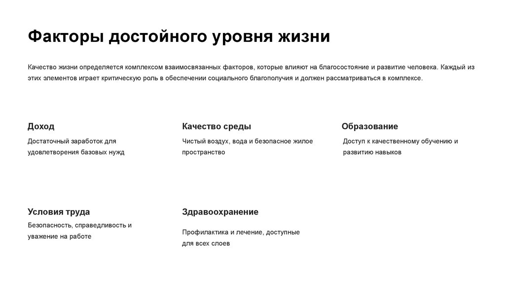 Факторы достойного уровня жизниКачество жизни определяется комплексом взаимосвязанных факторов, которые влияют на благосостояние и развитие человека. Каждый из