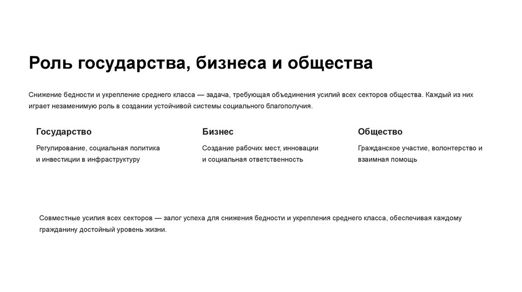 Роль государства, бизнеса и обществаСнижение бедности и укрепление среднего класса — задача, требующая объединения усилий всех секторов общества. Каждый из них