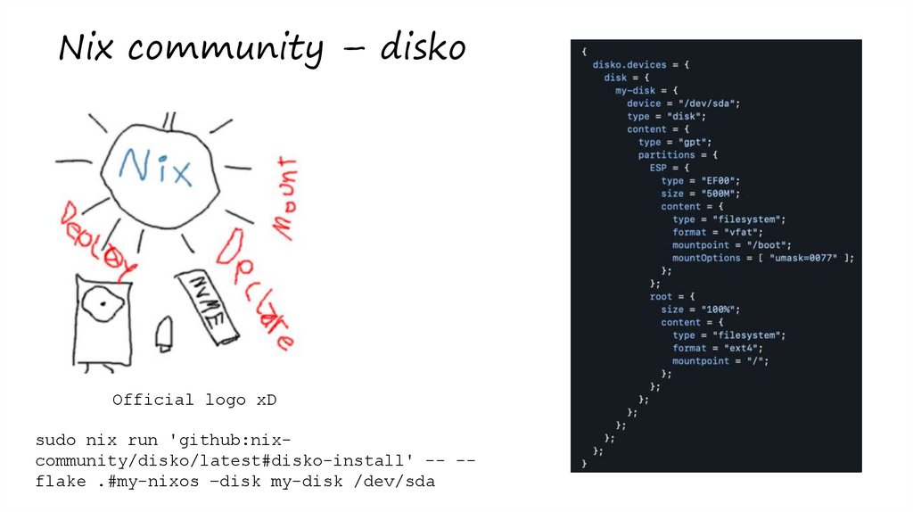 sudo nix run 'github:nixcommunity/disko/latest#disko-install' -- -flake .#my-nixos –disk my-disk /dev/sda