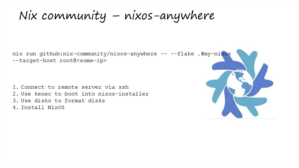Nix community – nixos-anywherenix run github:nix-community/nixos-anywhere -- --flake .#my-nixos